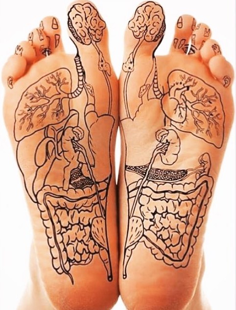 Siin pildil on näha, kuidas jalatalla all peegelduvad keha erinevad organid ja süsteemid: siseorganid (kopsud, maks jt) jalatalla all ning kael, aju ja pea varvastel.